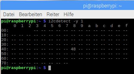 In der obigen Schaltung wurde ein PCF 8591 mit dem Raspberry Pi über I2C verbunden. Das Bauteil wurde auf dem Bus erkannt und dessen Adresse (48) ausgegeben. Der I2C- Bus ist funktionsfähig eingerichtet. Wären weitere I2C Geräte/ Bauteile mit dem I2C Bus verbunden, würden auch deren Adresse angezeigt.