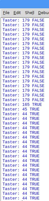 print("Taster:", analog0, "TRUE") # Ausgabe von 'Rohwert' und Boolean: Taster wurde betätigt