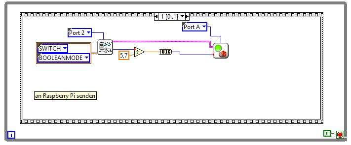 - Zum senden der Daten, vom NXT zum Raspberry Pi, wird ein Motorausgang des NXT genutzt. Dieser gibt ein PWM- Signal (Pulsweitenmodulation) aus. Dieses PWM- Signal wird in ein Analog- Signal umgewandelt. Da der Raspberry Pi wiederum keine Analogen- Eingänge besitzt, wird dieses Signal anschließend über I2C an den Raspberry Pi gesendet.