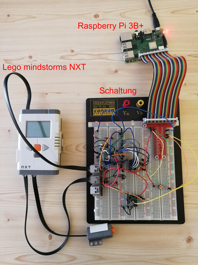 Der Lego mindstorms NXT lässt sich nicht direkt mit dem Raspberry Pi über die I2C- Schnittstelle verbinden. Um das Problem der Spannungsdifferenz zwischen Raspberry Pi (3,3V) und NXT (4,3V) zu beheben, kann ein I2C- Repeater (PCA 9517) eingesetzt werden. Infolge dessen erkennt der Raspberry Pi auf der I2C Leitung etwas, aber es sind willkürliche, nicht brauchbare Daten. Das kommt daher, da der NXT mit einer Baudrate von 9600 bit/sec. und der Raspberry Pi mit einer anderen Baudrate arbeitet. Die Baudrate beider Geräte lässt sich nicht angleichen. Daher verstehen sie sich nicht.