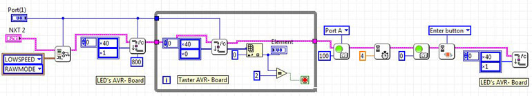 Verbindungen auf MyAVR- Board: - Taster1 --> Port-D.2 - LED-Rot --> Port-B.0 - LED-Gelb --> Port-B.1 - LED-Grün --> Port-B.2 Verbindungen MyAVR- Board zu mindstorms NXT: |