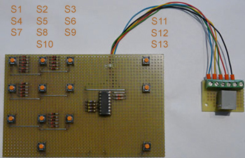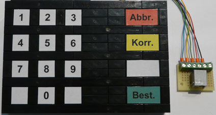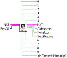 | Eingänge NXT Verbindung um den Programmablauf festzulegen Port (Port(1)) Port an dem der Sensor angeschlossen ist. Standard ist Port 1. Ausgänge NXT Verbindung um den Programmablauf festzulegen 0-9 TRUE (jeweiliger Taster ist betätigt); FALSE (jeweiliger Taster ist nicht betätigt) ein Tatser 0-9 betätigt? TRUE (ein Zahlentaster ist betätigt); FALSE (kein Zahlentaster ist betätigt) Abbrechen TRUE (S11 ist betätigt); FALSE (S11 ist nicht betätigt) Korrektur TRUE (S12 ist betätigt); FALSE (S12 ist nicht betätigt) Bestätigung TRUE (S13 ist betätigt); FALSE (S13 ist nicht betätigt) |