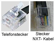 - Da Lego aus sicherheitstechnischen Gründen keine Telefonstecker verwenden konnte, ist bei den NXT’s der Flansch auf der rechten Seite. Standard ist aber, das er mittig ist. Deswegen ist es nicht möglich normale 6 Adrige Telefonkabel zu verwenden.