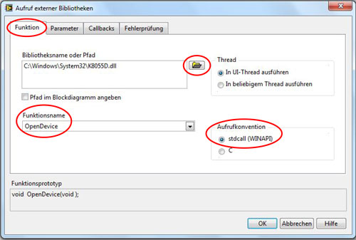 - Bibliotheksname oder Pfad: Pfad zur k8055D.dll
