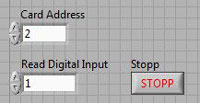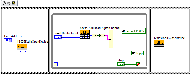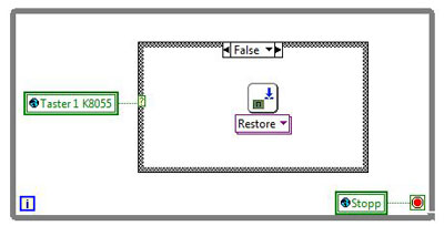 Wert von Digital Input 1 (Taster betätigt/ nicht betätigt) wird so lange in die Globale Variable Taster 1 K8055 geschrieben, bis der Stopp Button im Frontpanel betätigt wird.