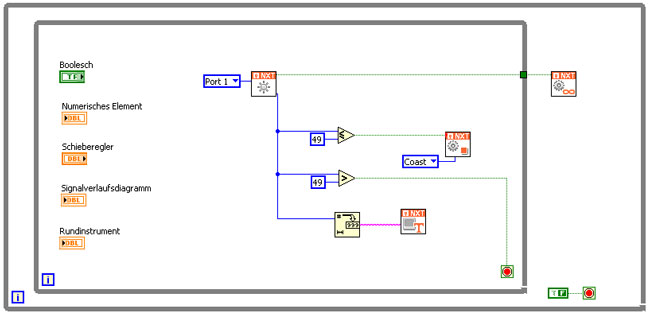 - "Boolesch", "Numerisches Element", "Schieberegler", "Signalverlaufsdiagramm" und "Rundinstrument" in innere While- Schleife verschieben