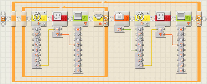 - Das Programm wird durch die äußere Schleife endlos wiederholt und kann beendet werden in dem auf dem nxt die Stop Taste (dunkel graue Taste) betätigt wird.
