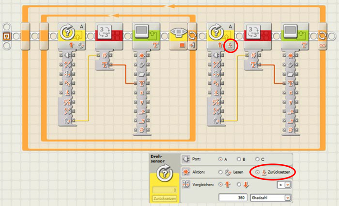 Vom "Drehsensor" wird die aktuelle Gradzahl an den Block "Konvertierung Zahl in Text" weitergegeben. Dieser Block wandelt eine Zahl in einen Text um, damit dieser Wert auf dem nxt Display angezeigt werden kann. - Wurde die innere Schleife beendet wird der Drehsensor zurückgesetzt und der Wert Null wird auf dem nxt Display angezeigt.