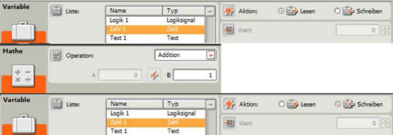 - "Zahl 1" kann so lange um den Wert eins vergrößert oder verringert werden, bis Taster an Port 1 betätigt und wieder los gelassen wird (Aktion: Stoß)