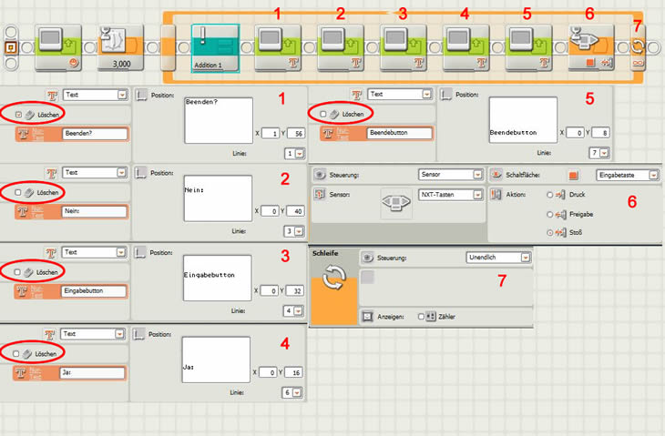 - Nachdem die erste Additionsaufgabe berechnet wurde, kann ausgewählt werden, ob man eine weitere Aufgabe berechnen möchte (Eingabetaste auf NXT betätigen) oder ob man das Programm beenden möchte (Beendentaste auf NXT betätigen).