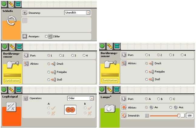 (Berührungssensor 1 gedrückt ODER Berührungssensor 2 gedrückt oder beide Berührungssensoren gedrückt --> Aktion "wahr" (Lampe an)) - Speichern